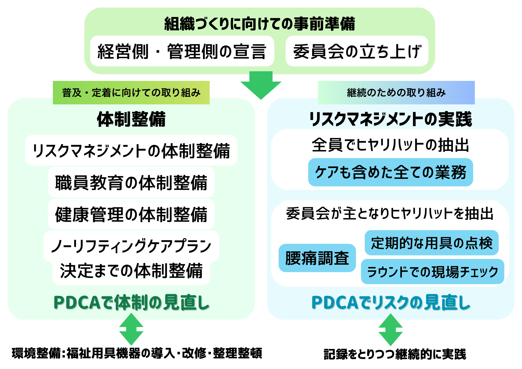 これらの“仕組み”をつくることがノーリフティングをルール化し継続的に取り組むためには重要になります。